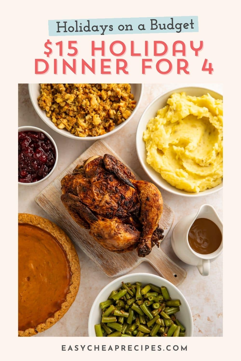 - This budget holiday dinner menu includes a rotisserie chicken, stuffing, mashed potatoes, green beans, cranberry sauce and gravy, as well as a homemade pumpkin pie to finish! This really is a full Thanksgiving dinner!