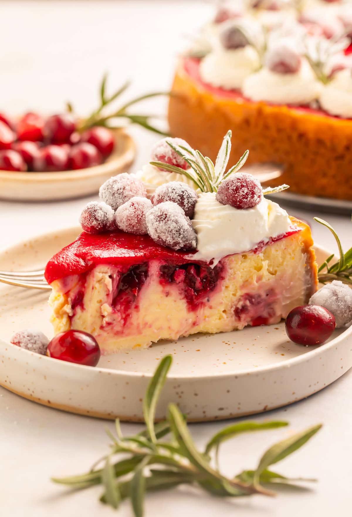 - Decorated with sugared cranberries and rosemary sprigs this is a real showstopper of a holiday dessert, and it just gets better as you slice into it to reveal the cranberry swirl inside! But, if you like your desserts simple or this is just going to be one of many on the dessert table the whipped cream and sugared decorations are totally optional.