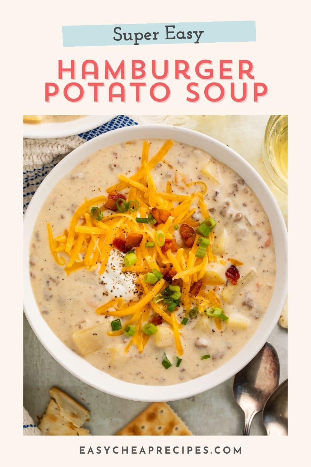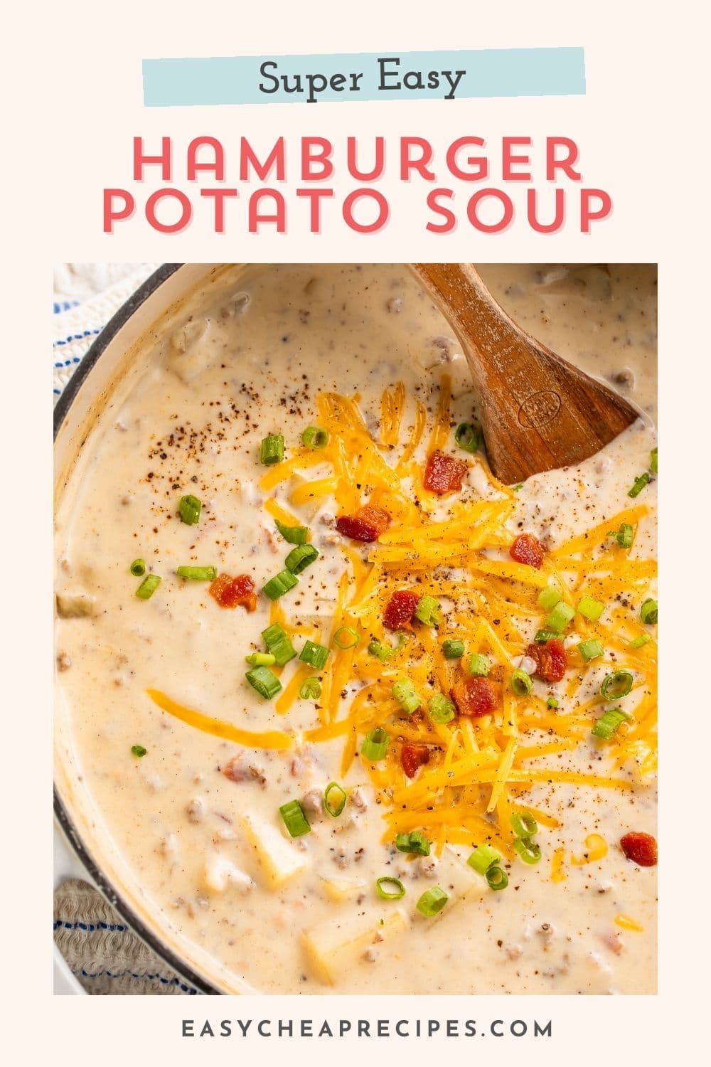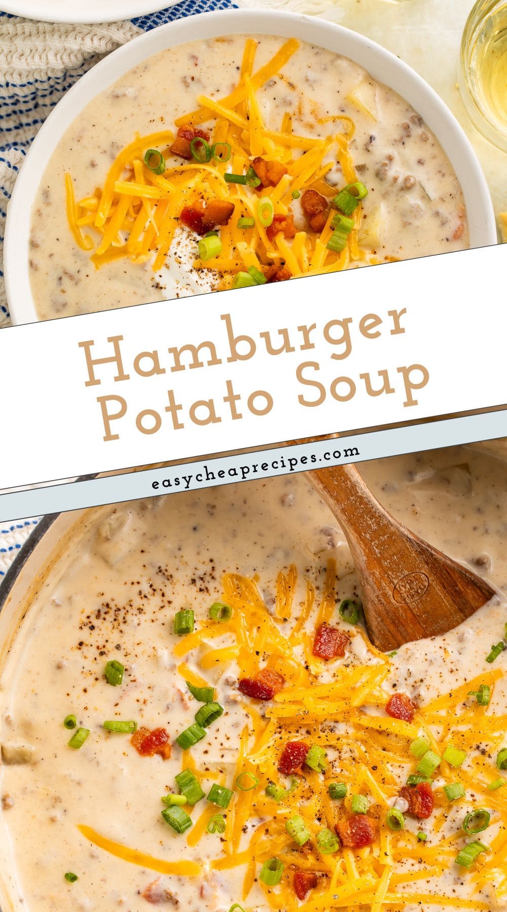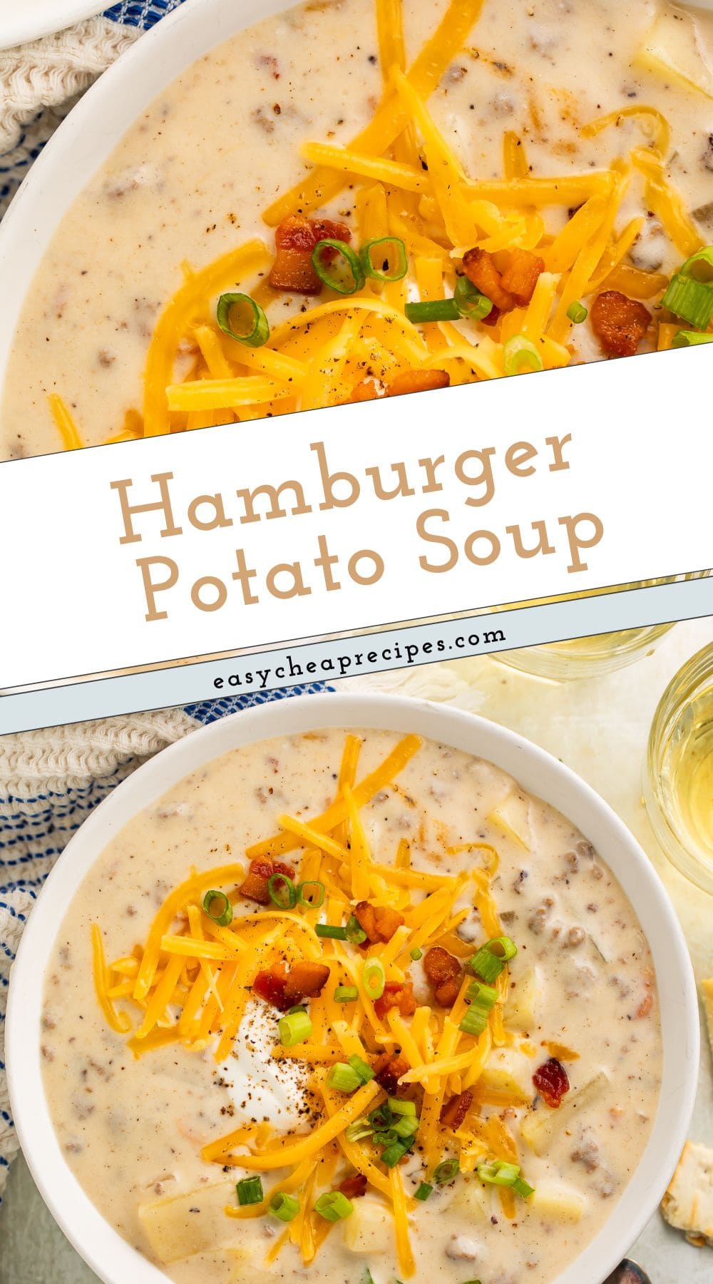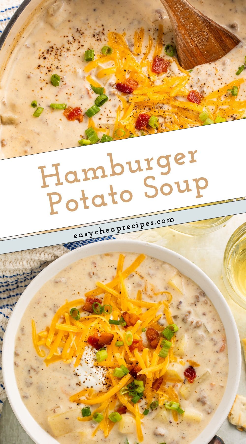 - With creamy, comforting, cheesy flavors, ground beef and big chunks of tender potatoes this Hamburger Potato Soup recipe is totally family-friendly – everyone will be asking for a second helping!