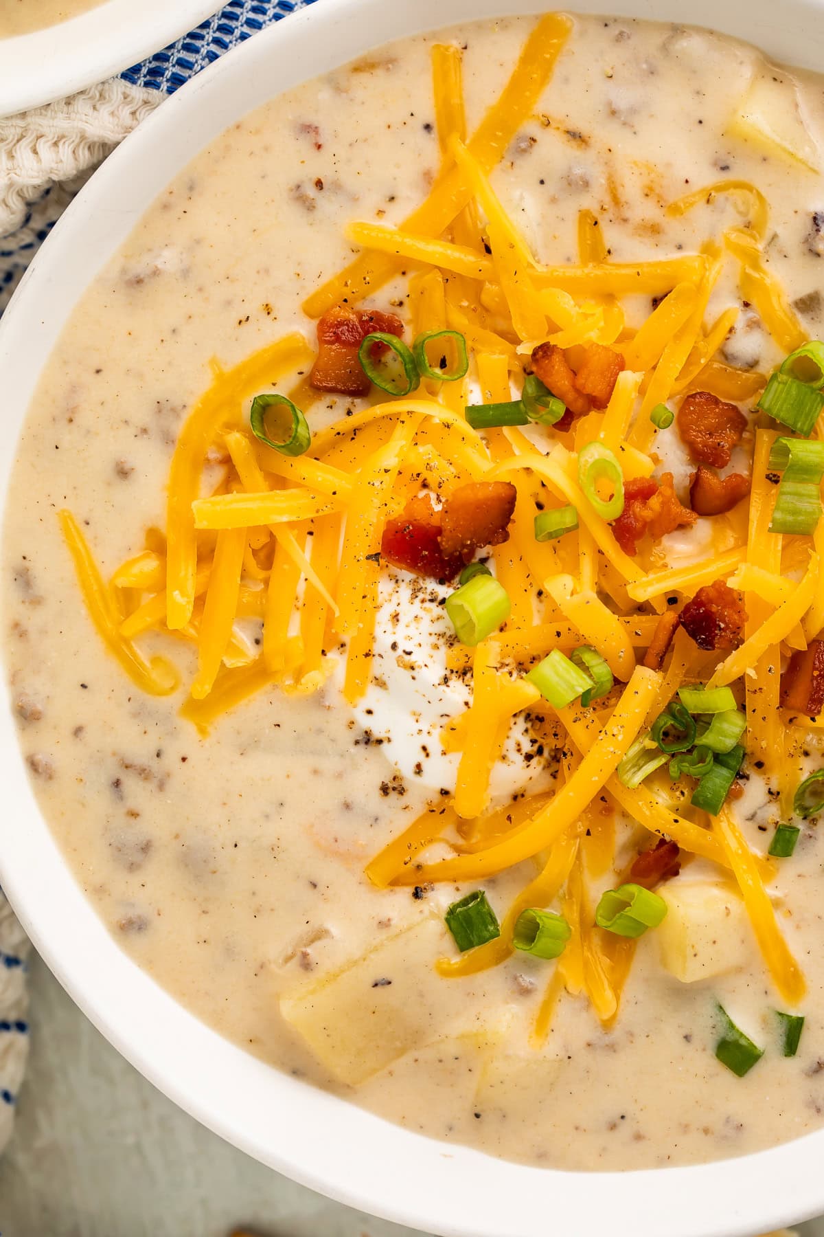This hearty and super creamy Hamburger Potato Soup recipe is the perfect family dinner for cold winter nights! With tender ground beef and potatoes in a rich, sour cream-spiked broth, bowls of creamy beef soup are topped with shredded cheese, crispy bacon bits and green onions for plenty of texture and flavor in every bite!